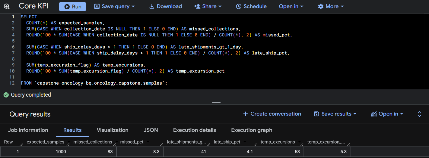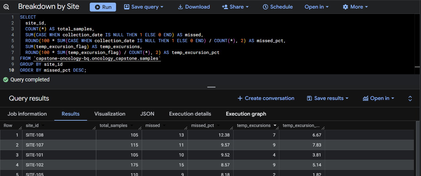 This query summarizes total samples, missing collections, and temperature excursion rates by site to identify operational risk areas.