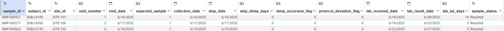 • temp_excursion_flag – Indicates whether the sample experienced temperature deviation during transport