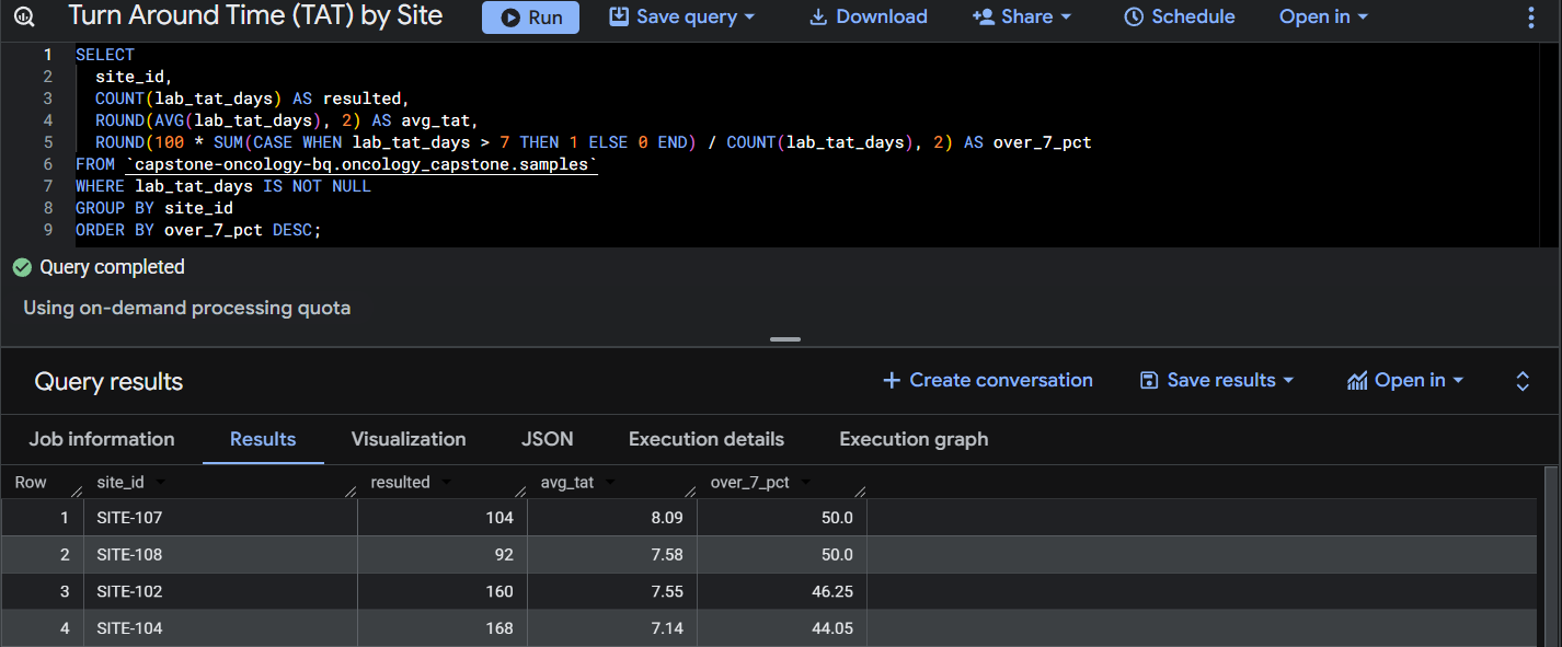 Query 3: Turn Around Time (TAT) by Site.